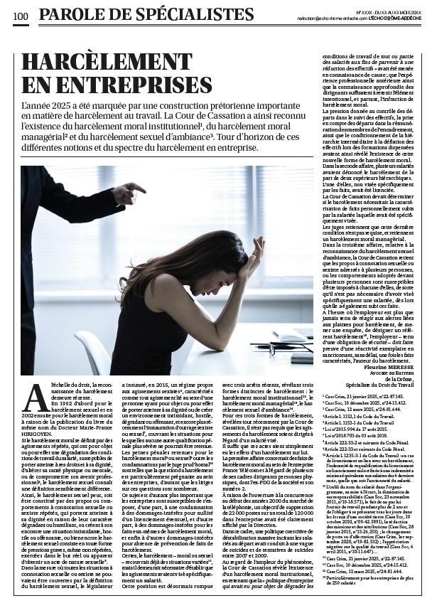 En 1992 d’abord pour le harcèlement sexuel et en 2002 ensuite pour le harcèlement moral à raison de la publication du livre du même nom du Docteur Marie-France HIRIGOYEN.